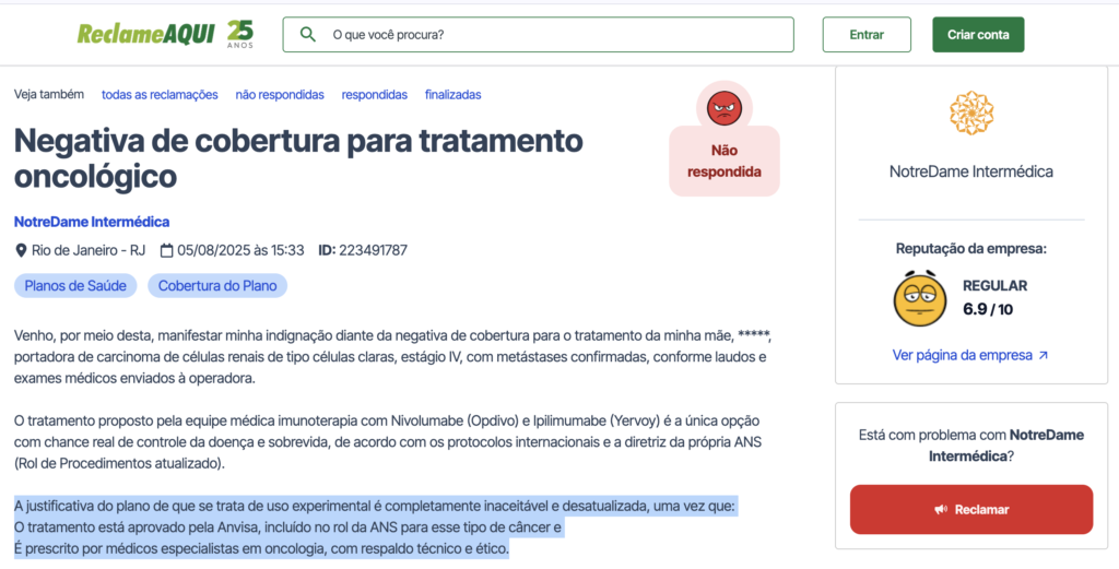 Outra estratégia comum é classificar o uso do Nivolumabe como “experimental” ou “off-label” (quando o uso não está exatamente igual ao que consta na bula). A operadora tenta sugerir que o tratamento não tem segurança comprovada.